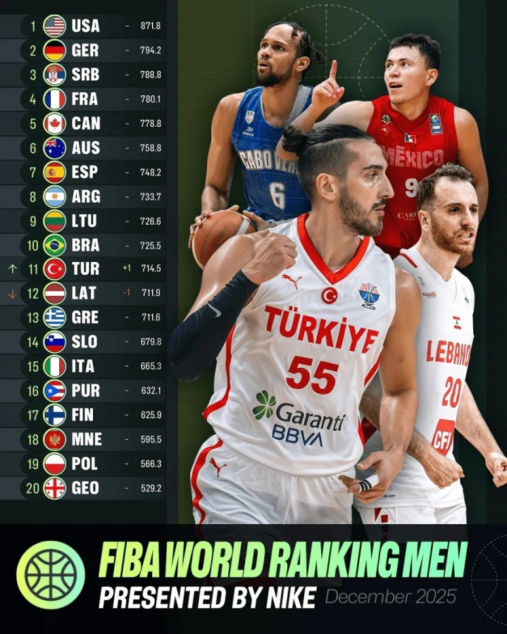 在男篮世界排名前二十位球队当中,仅土耳其男篮上升一名来到第十一位,拉脱维亚男篮下降至第十二位。