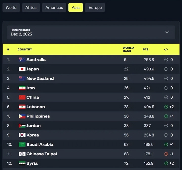 至于在亚洲区,中国男篮虽然在世预赛主客场被韩国男篮双杀,但依然排名世界第27名,黎巴嫩男篮上升2位来到第28位。